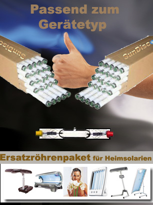 3) wir bieten Ihnen , passende, kpl. Röhrenpakete für ihre Heimsolarien (Klicken Sie bitte auf das Bild) an. Die Pakete gibt es in verschiedenen Bräunungsstärken und es gibt auch Alternative Bestückungen mit Collagen (Link: Hautverjüngung ohne Bräune) - oder CollaTan Röhren (Link: Hautverjüngung mit Bräune).